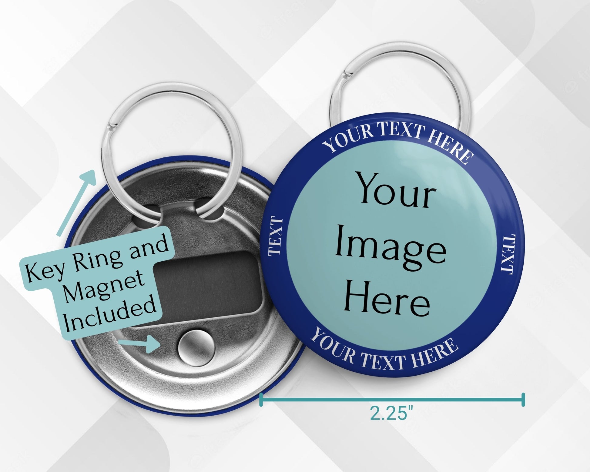 Take your keepsake to the next level with our custom 2.25" round bottle openers, designed with your photo in the center and a custom-colored ring with text around the rim.